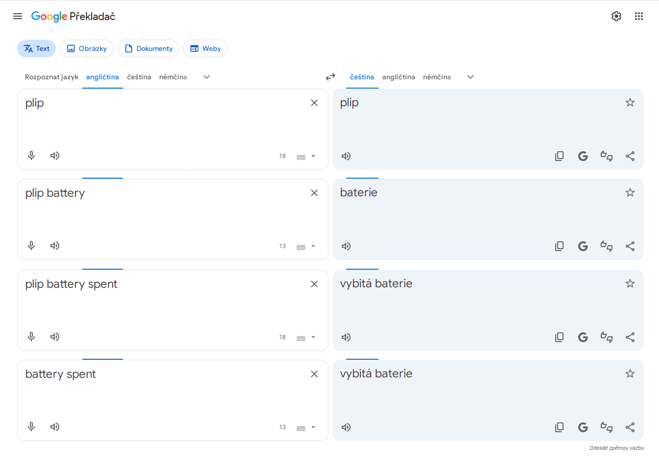 "Plip battery" sice Ujec Ghůůghl nezná, ale "plip battery spent" jako jednu z nabídnutejch variant už jo - překlad je "vybitá baterie". _________________ Nasliněný prst na svorkovnici domovního rozvaděče: Jó, paninko, máte tam ty Voltíky všecky...