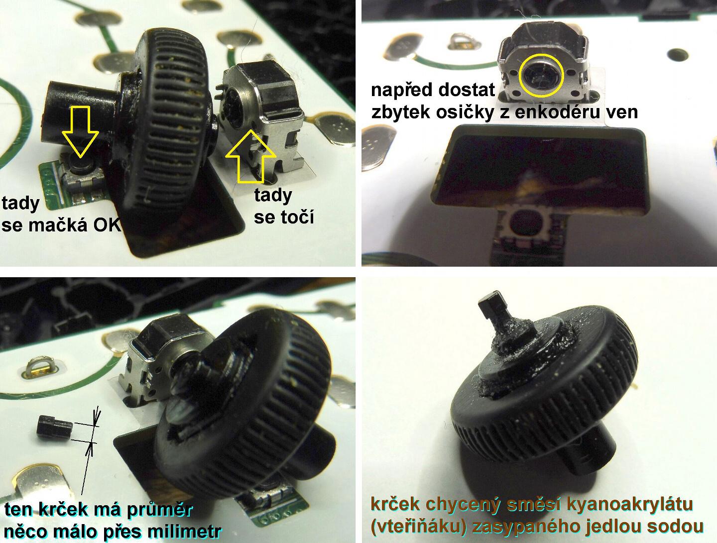 Ty ulomené osičky opravuji tak, že dírku v kolečku provrtám durch a do otvoru pak zasunu zbroušený šroubovák torx (tuším T9). Jeho velikost přesně pasuje do otvoru enkodéru. Tuhle osičku už nikdo nezlomí.