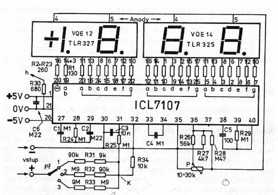 postavil jsem voltmetr se 7107 (podle schematu dole) a mam stejny problem s kolisanim posledni znakovky (0-3) - bez pripojenyho merenyho napeti i s nim. napajeci napeti mam stabilni, frekvence oscilatoru asi 46kHz... vsechno moje patrani marny . akorat jsem zjistil, ze kdyz se pri mereni dotknu rukou hrotu, neprestane to uplne, ale docela se to zlepsi. uz sem prosel forum i net, takze ted zkusim opatrit kvalitnejsi kondiky a pohrat si dalsi odpoledne s ladenim , ale kdyby nekoho jeste neco napadlo, jak tomu pomoct, budu vdecnej!