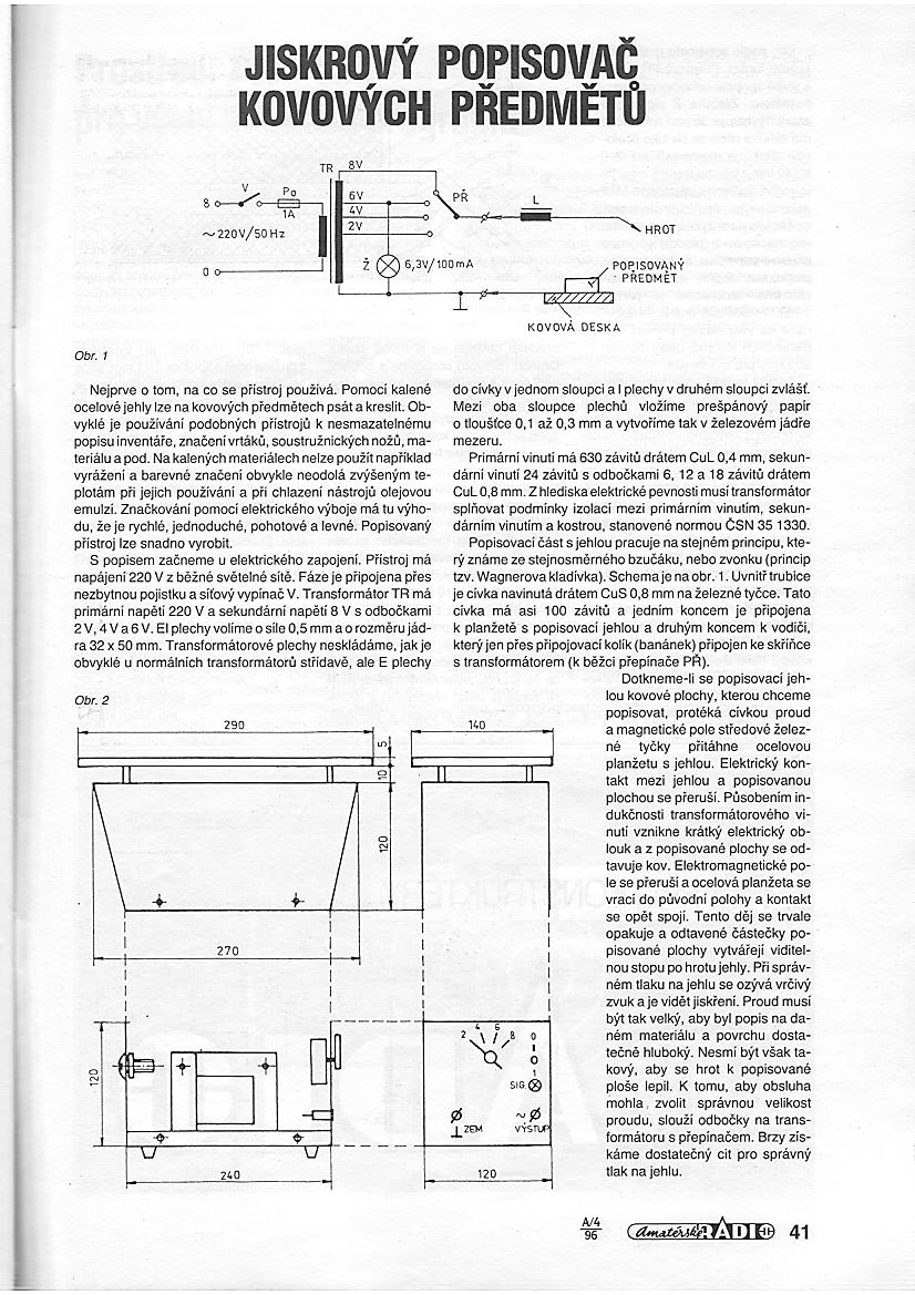 Takovou popisovačku jsem stavěl před dvaceti léty pro firemní potřebu. Transformátor měl sekundár asi 12V, byl složený bez mezery, ale dost se hřál. Protože jsme nepopisovali 8 hodin nepřetržitě ale jen podle potřeby, nic jsem neřešil a fungovalo to několik let. Ještě mám někde čmáranice jak to vypadalo, protože byl zájem i o druhý kus. Místo hrotu jsme dávali kus drátu ze svářečky CO2.
