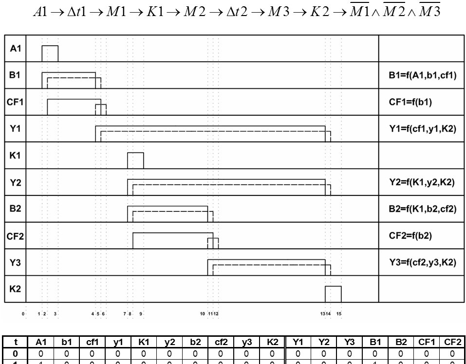 Ide o vzťah K1 -> M2 -> dt2 . Domnievam sa, že takto ako to mám nakreslené by to to bolo správne vtedy, ak by algoritmus zmien bol nasledovný "K1 -> M2 zaroveň dt2". V mojom prípade mám mať nábeh vstupu pamäťovej funkcie B2 až po nábehu výstupu Y2 (a nadvezne posun CF2). Je moja domnienka správna?