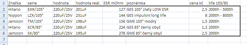 tak jsem dneska provedl menší orientační test elytů co se týče ESR + kapacita a tak nějak seřadil podle toho co je dostupné GME/GES