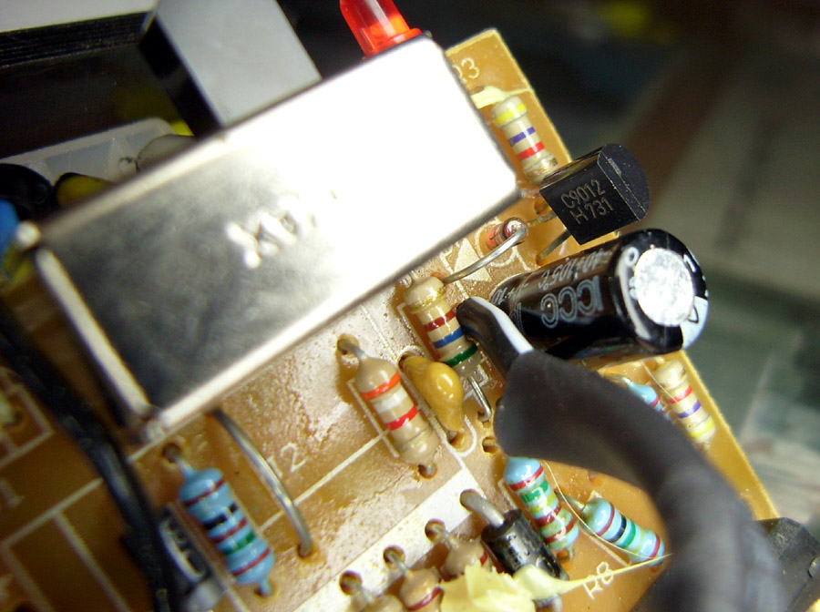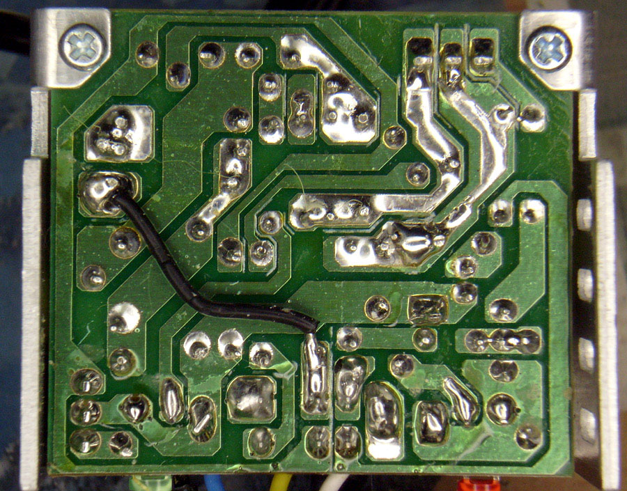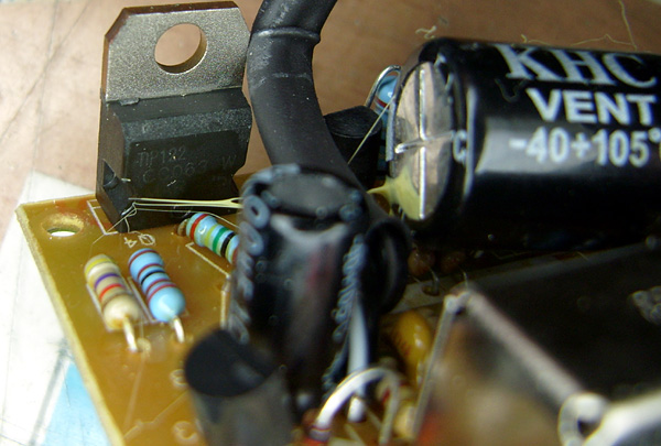 Chladič je na švába prilepený epoxidom nakrivo, nedosadá celou plochou. Typ sa mi nepodarilo uhádnuť, zo strany spojov vidno, že vývody 5-8 sú spojené dokopy. Na výstupe polyswitch, ako ochrana proti skratu a prepólovaniu.