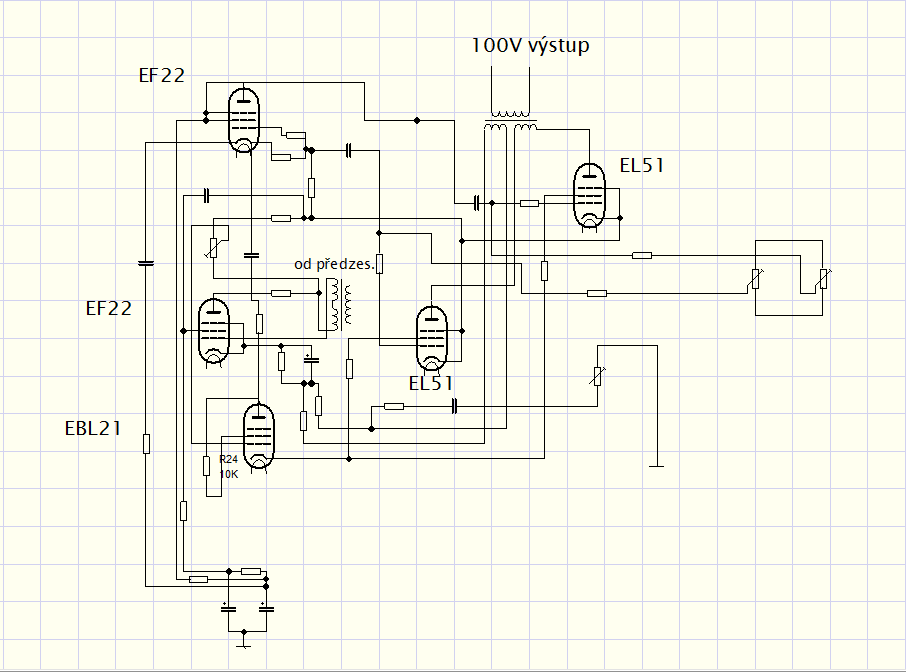 Příkládám schéma. . . snad se v něm někdo vyzná... (druhé vinutí na výstupním trafu je zpětná vazba ). střed je na + anodového napětí, pokud by vám to nějaké zapojení připomínalo napište. Dík moc.