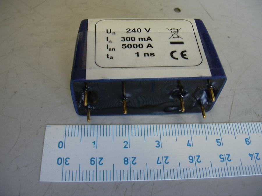 Ten váleček je samozřejmě výbojka, provedení může být viz předchozí příspěvek. Pouze bylo konstatováno, že ochranné vlastnosti jištění výrazně zlepšuje indukčnost, která tlumí náběhovou špičku přepěťového impulsu. Může býti vinutá, např. na nějakém feritovém kroužku, nebo je z cenových důvodů nahrazena levným drátovým odporem ( což byl např. příklad popisovaného jištění ), jehož vinutí tvoří tuto indukčnost. Toto ovšem vždy tvoří určitý filtr, který tlumí vf signál xDSL atd atd. Jinak dobří výrobci udávají na jištění hodnoty, např. provozní napětí Un, proud, který jištění přenese v klidu, špičkový proud při přepětí, např. 5000 A ( pěttisíc ampér, z tohoto údaje je zřejmé, jak kvalitní musí být uzemnění, aby to vše mělo smysl ), reakční dobu v ms. Z toho je vidět, že různá "zaručená" jištění, k dostání ve všech elektroobchodech, jsou v podstatě haléřové výrobky bez zaručení jakýchkoliv parametrů. Po technické stránce je možno konstatovat, že dobré jištění xDSL v přijatelných cenách zatím neexistuje. Ale i např. dobré jištění faxu přijde stojí vždy více, než samostatný fax. Na 1. fotografii je modul jištění pro 1 telefonní linku od českého výrobce, na dalších fotografiích je jištění pro 2 linky se svorkovnicí, vpravo vedle modrého relé TAKAMISAVA jsou 4 vinuté cívky na toroidním jádře, mezi cívkami a šroubky je černý obdélník polovodičového přepěťového jištění ( obch. název TRISIL, druhý je vyletován ), úplně vpravo jsou dva válečky výbojkového jištění. Signál xDSL samozřejmě přes ně neprojde.