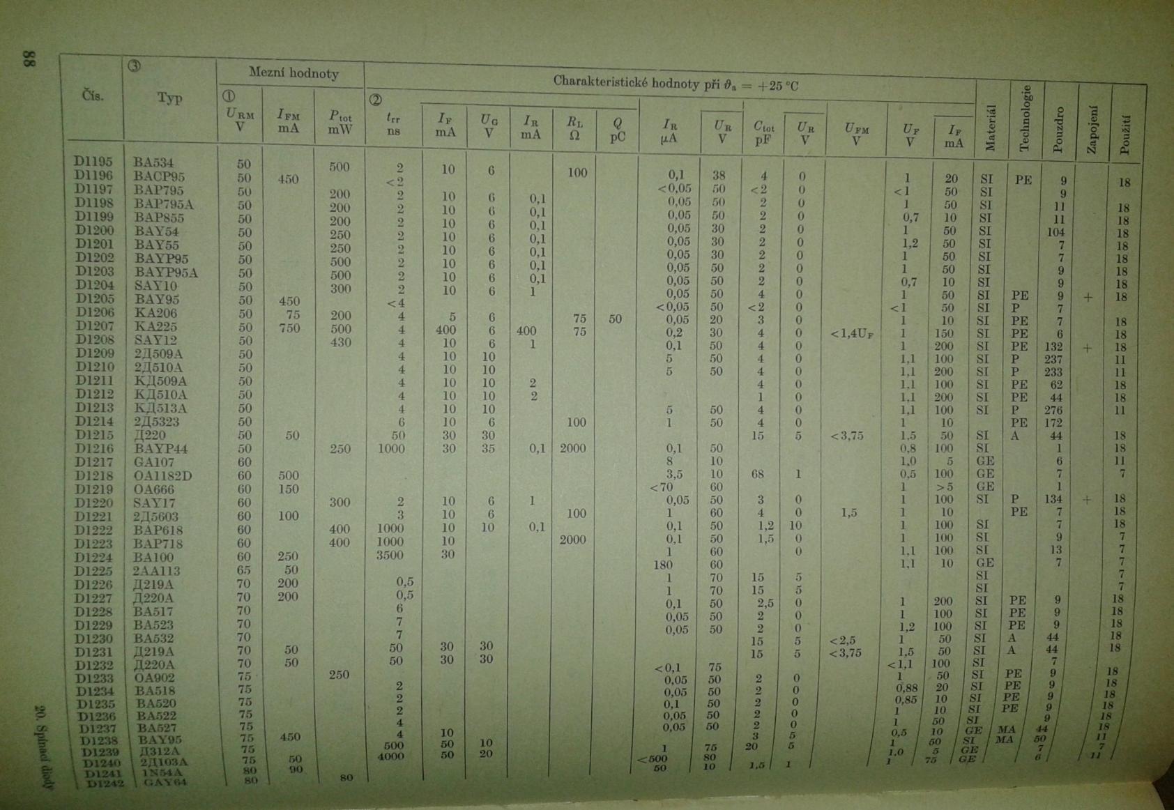 - doba zotavení do 2 ns při zavírání z ustáleného proudu 10 mA na závěrné napětí 6V, čas měřen při poklesu proudu na 1 mA.