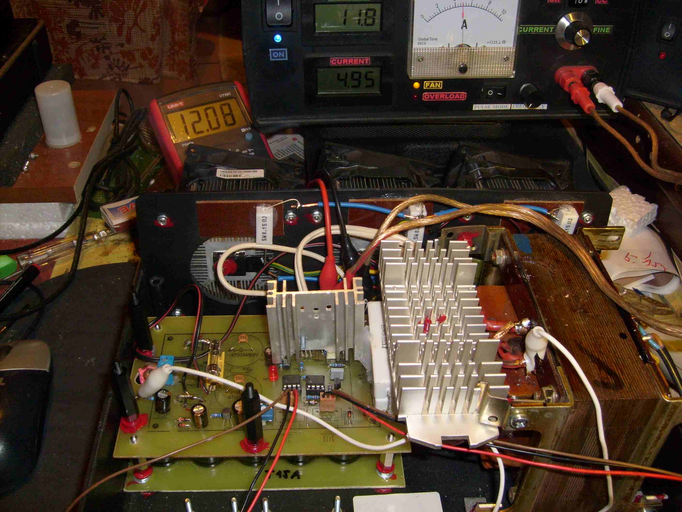 Vystupni napeti 5V a proud 10A. Ztrata na trech TIP3055 cca 200W, ale chladice to bezproblemu uchladi.