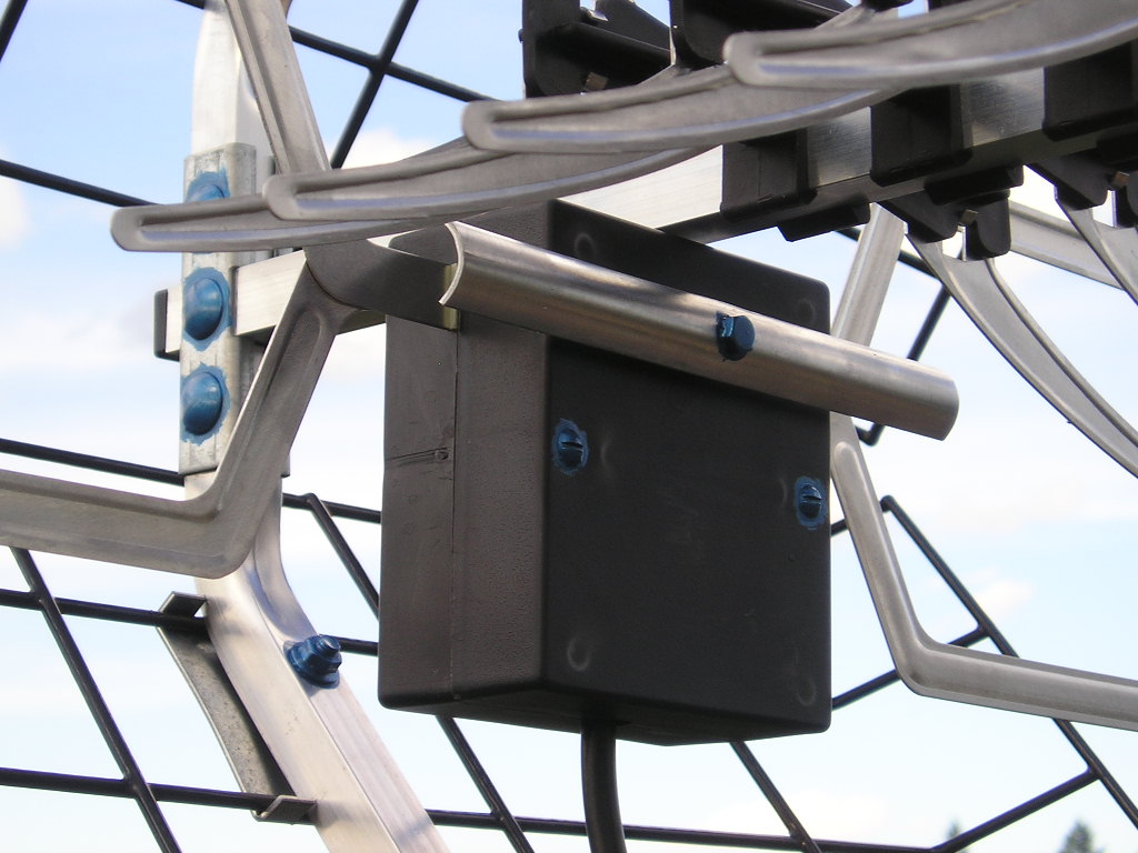 Oni naštěstí z principu nemohli dát parabolku výš než na doraz ke spodnímu výztužnému ráhnu, takže vlastně poměrně daleko od direktorů. Což je dobré pro obě strany. Jelikož by to spodní ráhno nemělo vadit funkci antény, tak je snad parabola dost daleko.