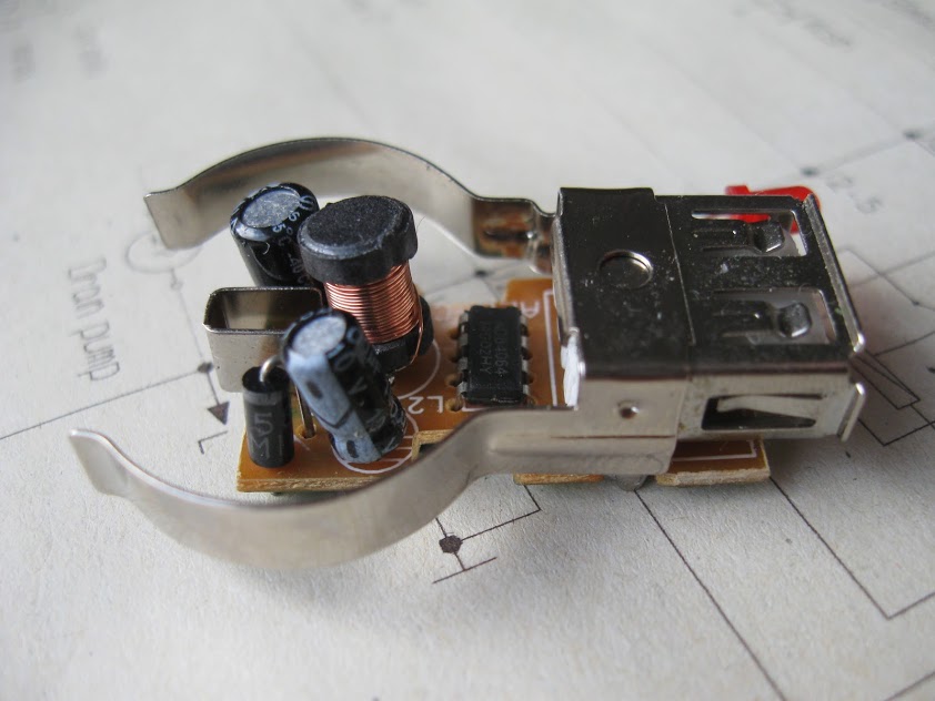 Našel jsem ve smeťáku USB adaptér do auta, tak jsem ho kuchnul. Chyběl tam jeden kontakt. Je tam spínaný měnič s AD84064.