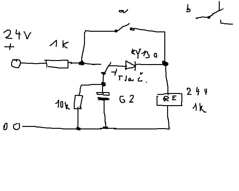 Při stisku tlačítka se nabije C, při puštění se přes diodu mžikově sepne relé, jehož kontakt a zajistí samodrž. Zapínání OK.