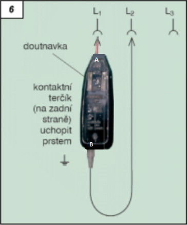 Důležité je měřit hrotem v pozici A a volný konec v pozici B , zároveň se můsite dotýkat zemnícího bodu viz obrazek. Při správném sledu fází by měla doutnavka svítit. Když fáze prohodíme měla by doutnavka zhasnout.