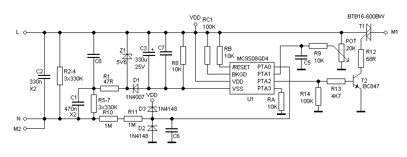 No, s opravou - moc nevím. Jestli se jedná o tento regulátor (univerzální, požívá se v řadě vysavačů), tak schéma překreslené mám (nic zákeřného v něm není) a jestli naměříš všechny hodnoty takové, jaké by logicky měly být (vůči VSS - na VDD a /RESET +5V, na PTA0 signál 50Hz a na PTA1 signál z trimru), popřípadě jestli překlenováním tranzistoru T2 otevřeš triak, tak bude ten obvod opravdu špatný - a ten se nijak rozumně nahradit nedá, tak koupit jedině celou novou desku. Ta může v ČR stát asi 550Kč, na Slovensku nevím.