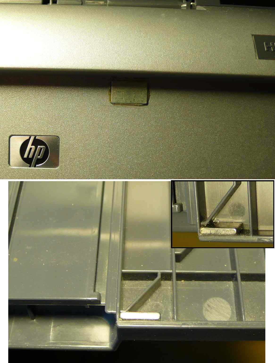 Inšpirácia pre ostatných. HP LaserJet P1006, odlomené úchytky vstupného držiaku papiera (P1005 to má tuším robené rovnako). Buď sa dá objednať nový držiak za cenu polovice hodnoty tlačiarne, alebo trochu improvizovať. Pokiaľ je to slabo odlomené a iba nedrží zavretý kryt, stačí nalepiť magnet a kúsok plechu. Pokiaľ sa podarí odlomiť aj doraz tak, že pri umiestnení tlačiarne na polici držiak papiera po otvorení odvisne dolu, treba opraviť aj doraz v pántoch. Stačí kúsok hliníkového plechu, skrutka z rozobratého notebooku, a prípadne kúsok gumy zo starej duše pre tlmenie nárazu.