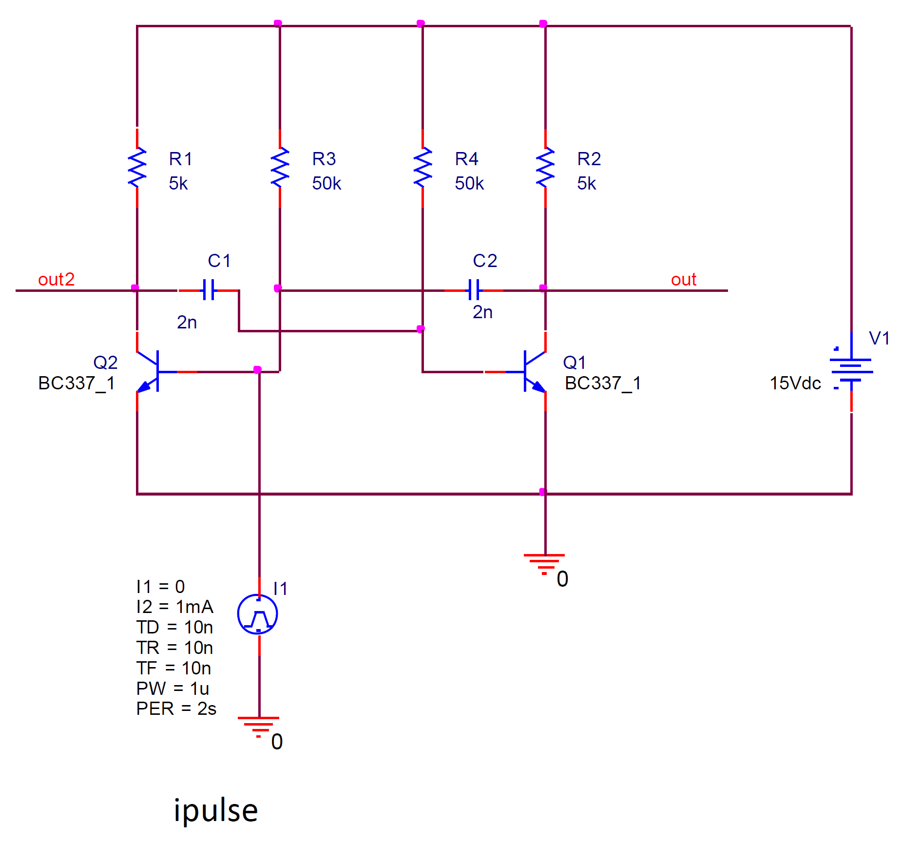 Kdyby někomu nechtěl kmitat multivibrátor v PSpice, tak vězte, že musíte zahájit oscilace nakopnutím pomocí prvku ipulse.