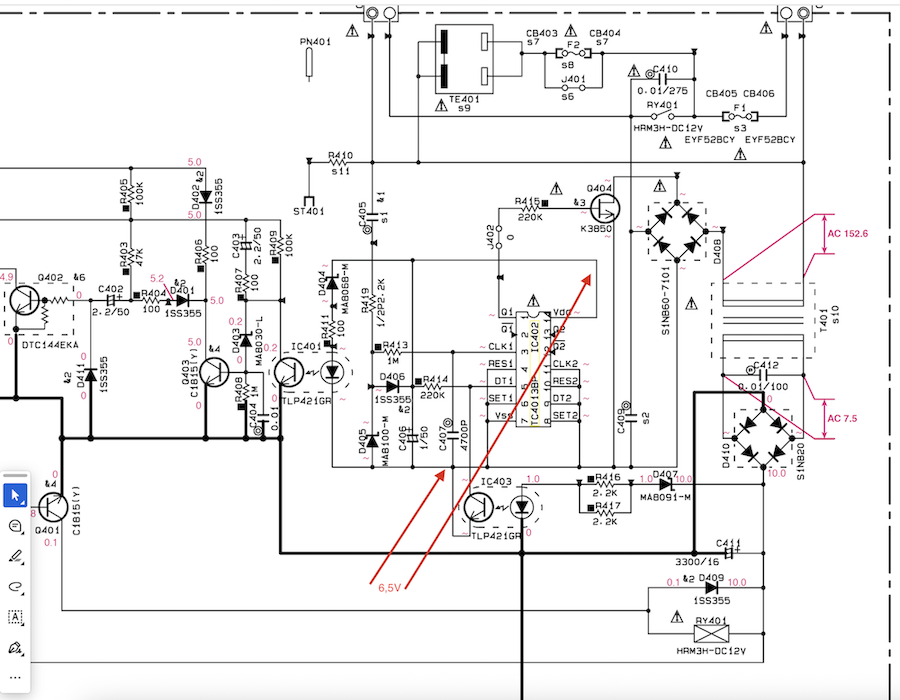 Niečo ti tam ten prúd "žerie" keď napätie spadlo na 6,5V ! Potom zareaguje PDET - optočlen IC401 ...možno je vadný, alebo R411, D404... Zenerky treba zmerať aj na zenerove napätie - diodatest nestačí!