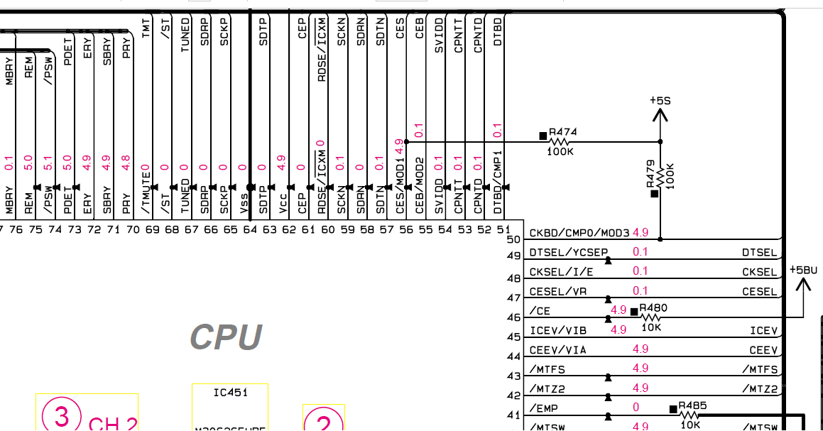 Když jsem šel po napájení procesoru,zjistil jsem,že z větve +5S jde napětí přes 100K odpory na piny 50 a 56. Na pinu 50 je to OK, ale na 56 už nspětí nedojde. Ztratí se na tom rezistoru. Samozřejmě je tento pin vyveden ještě na dalsí desku, ale z časových důvodů už jsem se k ní nedostal.