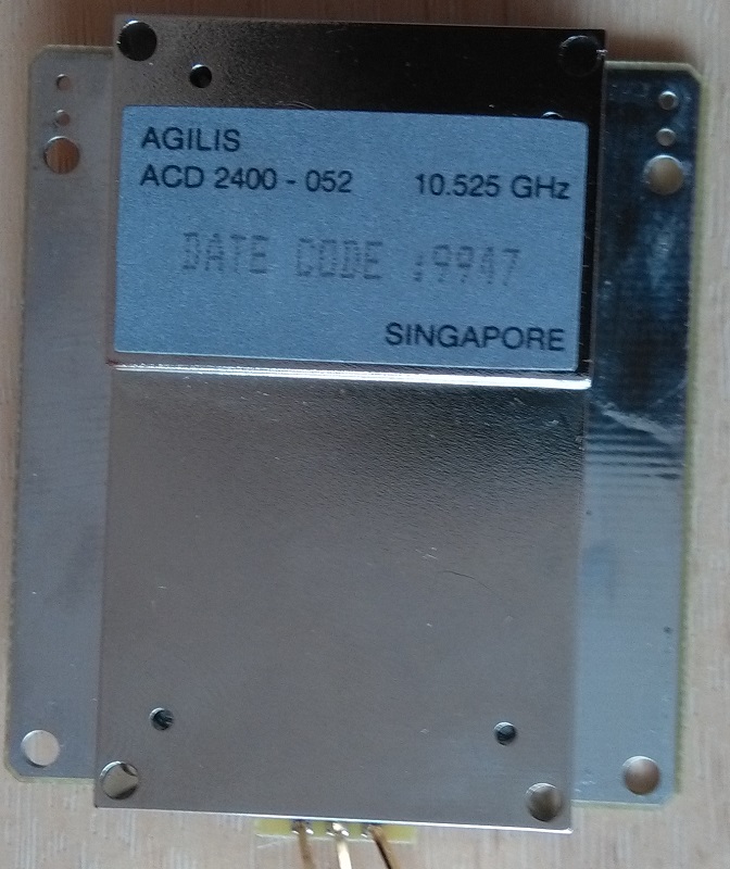 Zdravím, z blíže neurčeného PIR senzoru jsem vymontoval tento modul. Čidla mám dvě, tudíž mám dva moduly. Podobný radarový moduly jde vybrakovat i ze světel, dveří, či jiných aplikací. Mě osobně jde o to, že bych zkusit tento modul rozchodit samostatně. Podle informací, co jsem našel na netu, by uvnitř měl být oscilátor, a směšovač, který "mixuje" vysílaný a odražený signál (10,525GHz) a s rozdílovou frekvencí se nějak operuje.