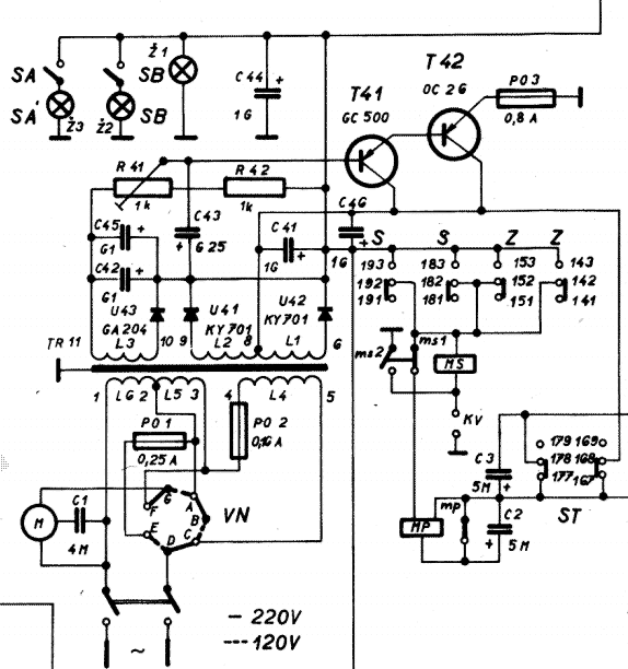 Ještě jiné schema zdroje, trochu čitelnější. K C42 je připojen ještě C45. Možná pochopili jeho důležitost. Navíc je tu ještě jedna změna - dioda GA204 v referenčním zdroji. Té bych věřil jako Kalouskovi...
