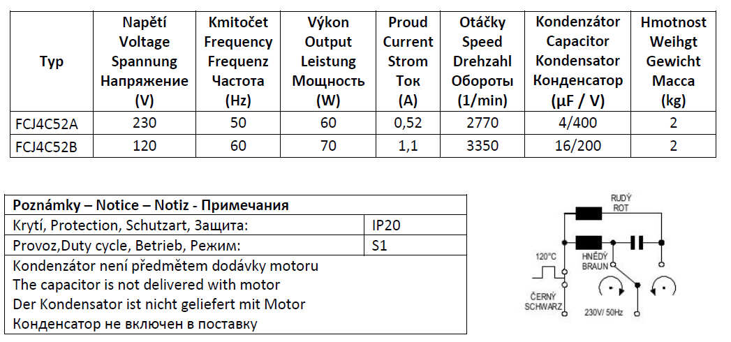 Chtěl bych se pokusit a plynulou regulaci otáčení motorku odtahového ventilátoru kotle Atmos C25S. Motorek je typu UCJ4C52 a podle nejbližšího typu FCJ4C52 (podle výrobce je elektrické zapojení stejné) je to jednofázový asynchronní motorek na 230V s dvěmi cívkami a třemi vývody (jeden společný vývod cívek a dva konce cívek).