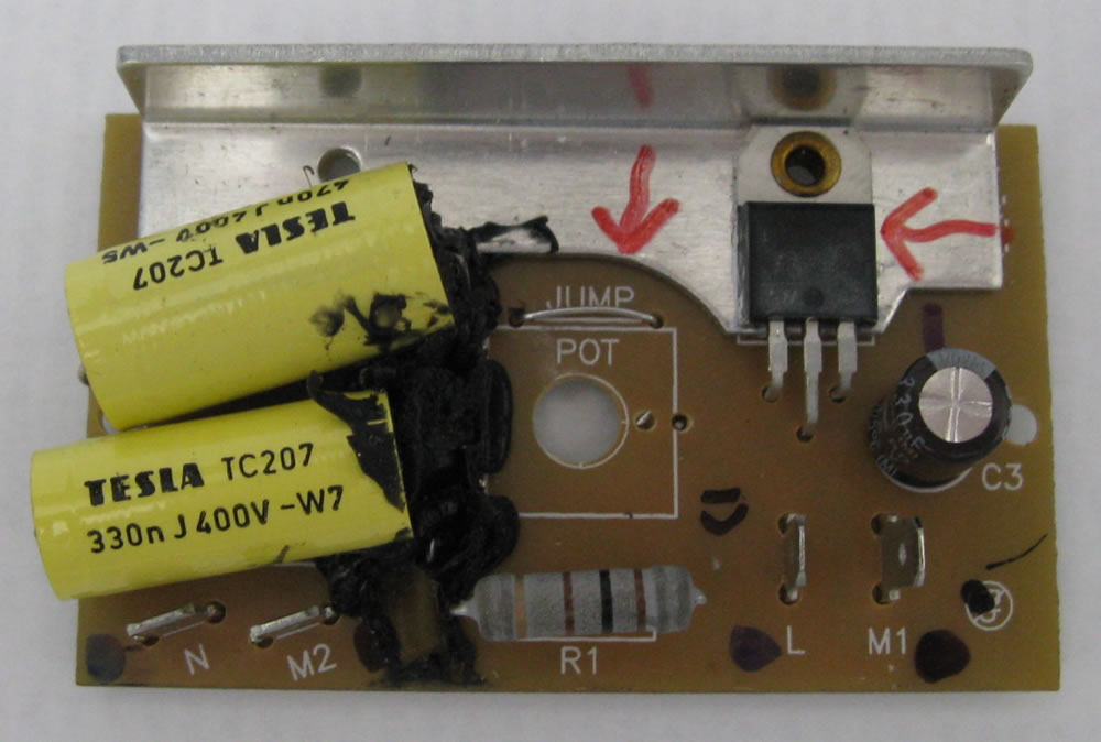 Mi se povedlo podobný regulátor opravit. Projev byl podobný. Oprava spočívala ve výměně onoho jediného elektrolytického konndenzátoru. Preventivně by to chtělo vyměnit i ty dva žluté svitkové kondy, můžou mít taky ztrátu kapacity. Místo na 400V by bylo víc než záhodno dát kondy na 630V nebo 275V střídavých. Pokud ovšem není už pozdě - podle těch nánosů kalafuny se v tom asi rýpal nějaký "odborník".