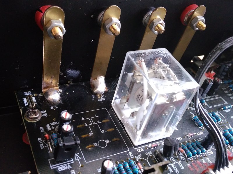Tak se tedy podíváme dovnitř. Při rozebírání jako první upoutají pozornost šrouby, které jsou stejné jako na předzesu Xiang Sheng, který jsem tu nedávno taky řešil. Dále pak výstupní svorky jsou zcela identické jako laciné šmejdy, které se prodávají na aliexpressu, včetně mizerných křivých závitů. Po oddeklování uvidíme černý plošný spoj, potisk používá klasický čínský font. Vysoké součástky jsou odřené, jak někdo s plošňákem pracoval na stole. Demontáž plošňáku je celkem snadná až na odpojení výstupních svorek, které jsou vyrobeny z bláta a povolení matice je možné jen párkrát, pak se závit orve. Po demontáži plošňáku upoutá velké množství kuliček cínu rozprskaných po celé desce a také materiál desky, což je ten nejlacinější pertinax I ten Xiang Sheng měl solidní desku z cuprextitu. Při demontáži mi jeden malý elyt zůstane v ruce, takže rovnou propájíme všechny studeňáky.