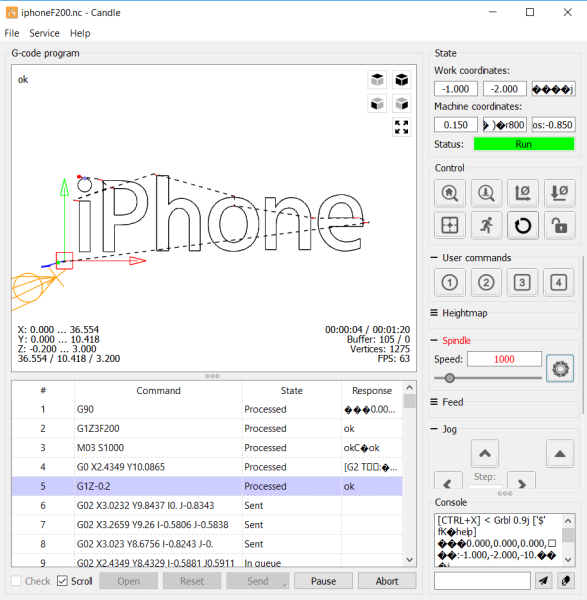 Pokud ovládám jednotlivé osy pomocí Candle, chodí to, fréza se točí, lze nastavovat otáčky a na první pohled není vidět žádný problém.