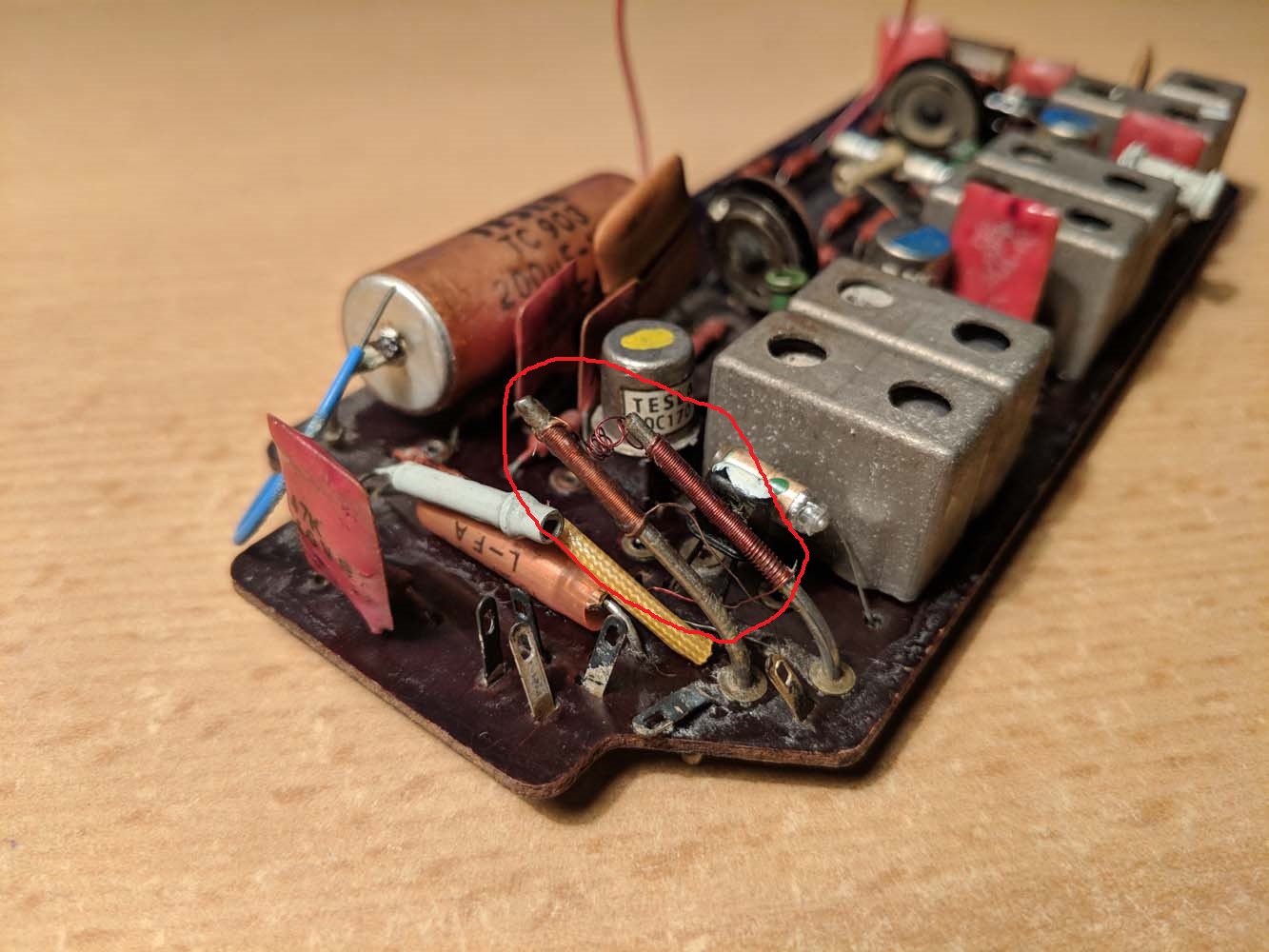 Sú tam dva zaujímavé prvky. Veľký keramický kondenzátor, ktorý asi nebude z ČS výroby. Zaujímave je, čo na ňom bolo tak zvláštne, že ho museli použiť. Druhá vec sú tie dva oceľové tŕne a navinutým drátom - podobá sa to na vyvažovacie prvky z elektrókových superhetov. Pôsobí to tam trochu archaicky až komicky. Je to mechanicky a elektricky nekryté, ale asi s tým neboli problémy.