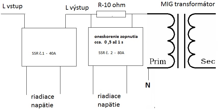 Dobrý deň. Chcel by som sa spýtať či by bolo možné vyrobiť soft-start podľa nižšie uvedenej blokovej schémy. ( teda nie len vyrobiť, ale či bude v reále aj fungovať)Sú tam použité 2 x SSR relé a malo by to slúžiť na MIG (CO2) zváračke. Zváračka je odbočkové jednofázové trafo. Chcel by som sa vyhnúť stýkačom a relé. Polovodičové relé nie sú špeciálne určené na indukčnú záťaž. Riadiaca jednotka vo zváračke nie je. Odišla predchádzajúcemu majiteľovi, takže vyrábam novú. Jedná sa o zváračku Mastromig 180 TWIN.