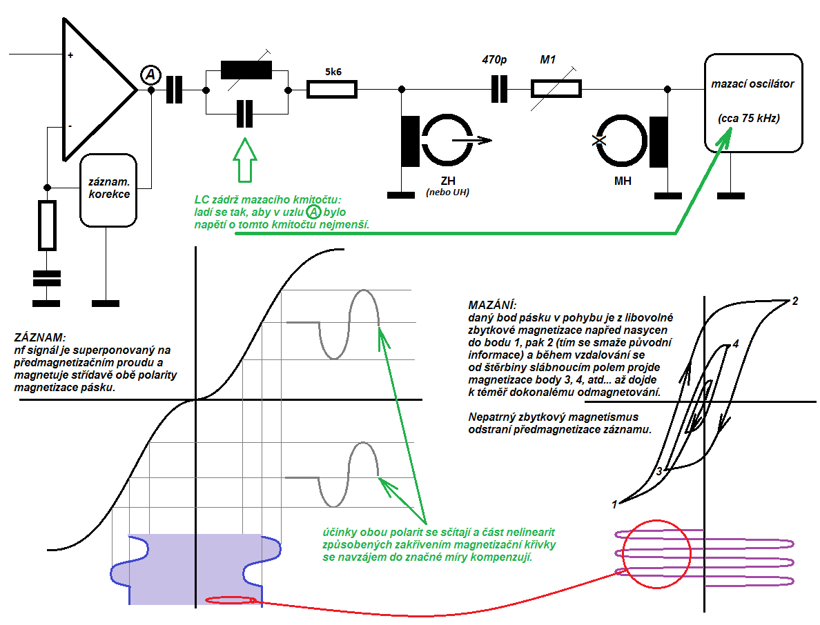 Edit: oprava překlepů a doplnění principu střídavé předmagnetizace i mazání. Obrázek ke střídavému mazání (potažmo zcela odmagnetovanému pásku) se stejnosměrnou předmagnetizací nemám, je to kontraproduktivní kombinace, proto jsem o ní v učebních materiálech ani neuvažoval...