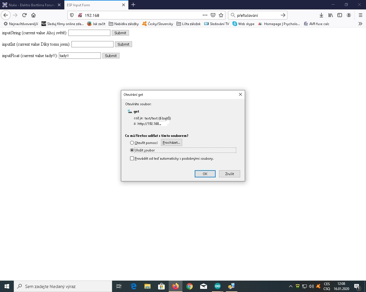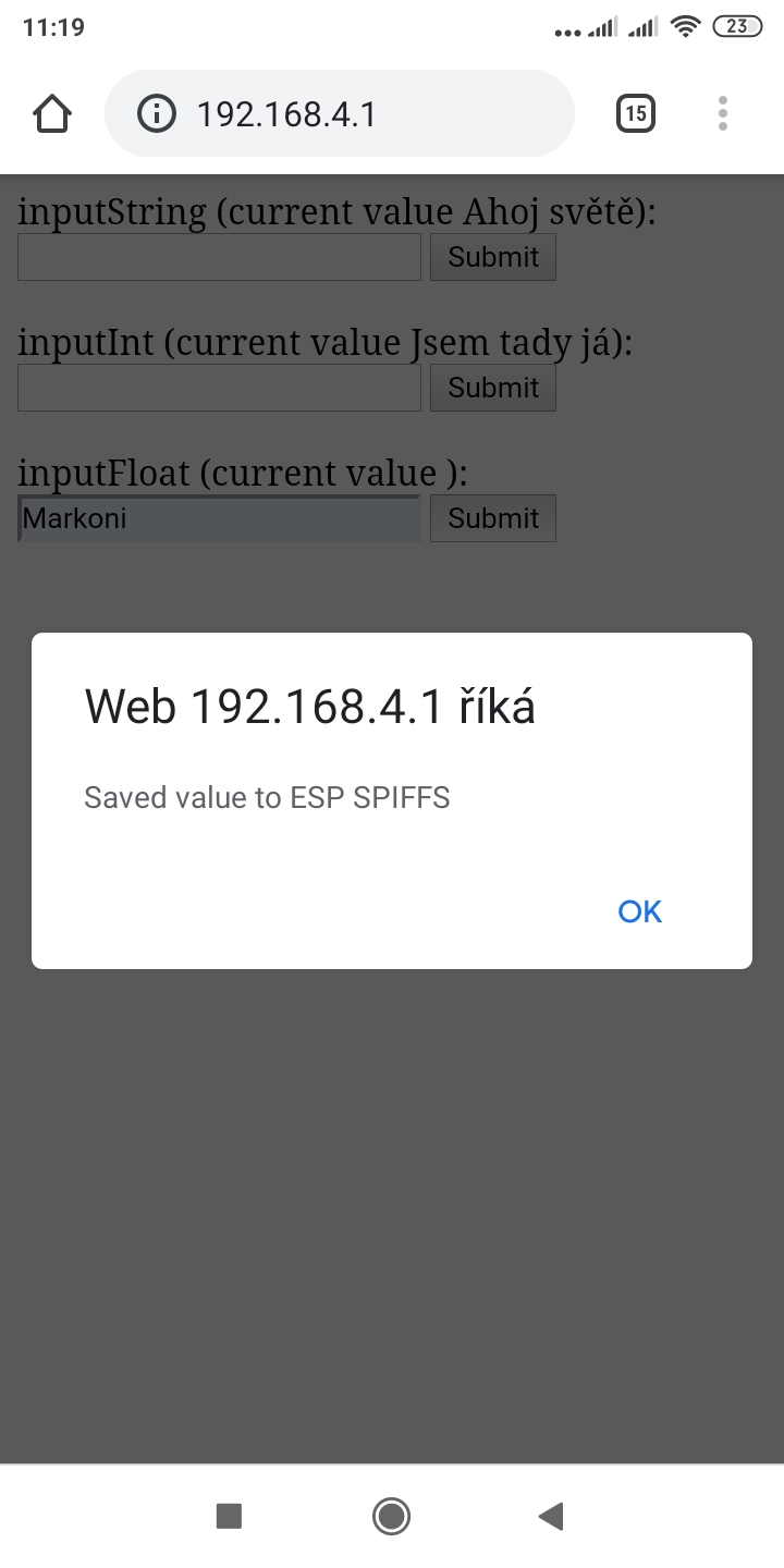 Další pokračování: za první jsem zjistil že uložené hodnoty zůstanou tam i při přeflashování celého ESP nebo nahrání jiného firmware Shocked to je první pro mne poznatek ,další věc jak se zbavím tohohle WEB 192.168.4.1 říká a tohohle dialogu otevírání get viz přílohy za třetí jak s redukovat tlačítka na jedno ale aby se tam mohly uložit více vstupních parametrů při stisku jednoho tlačítka ? díky