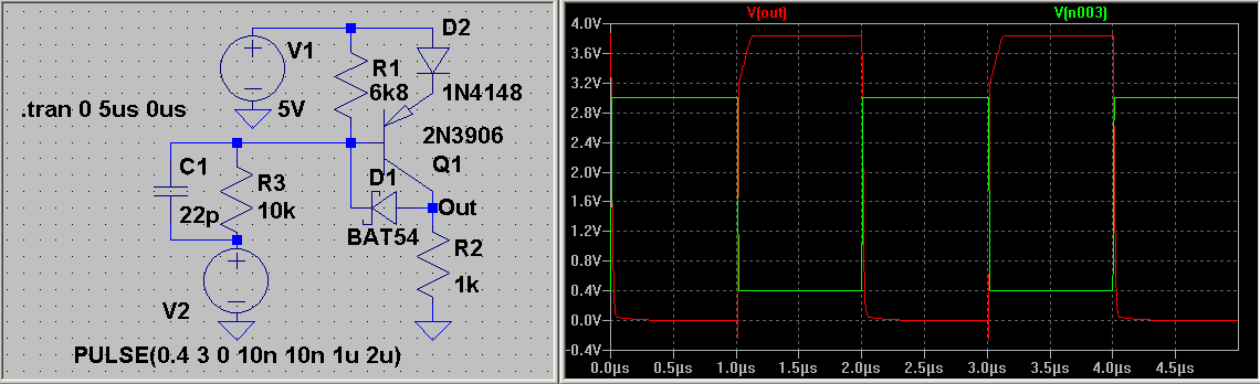 Potrebujem jeden TTL invertor. Zbastlil som niečo s tranzistorom (príloha), ale nefunguje mi to spoľahlivo (je to pomalé alebo ja neviem čo, nemám logický analyzátor a s multimetrom to vyzerá byť funkčné). Vľavo je vstup, vpravo výstup. Čo s tým? V bežnom stave je na vstupe log.1, tak je to navrhnuté aby to vtedy malo menšiu spotrebu.