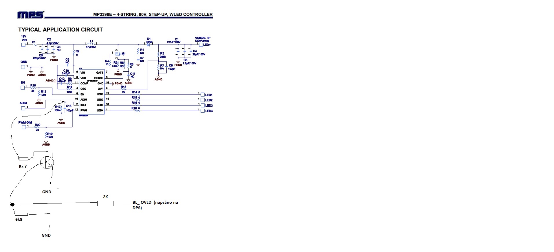 LED driver je zde : MP3398E . V jeho datasheetu není bohužel zapojení s tranzistorem atd zakresleno, takže nevíme co by tam mohlo patřit za hodnotu. Odkud je napojeno otevírání toho tranzistoru jsme zatím nezjistil V ostatních TV ,kde byl tento IO jsem neviděl toto zapojení s tranzistorem v této větvi
