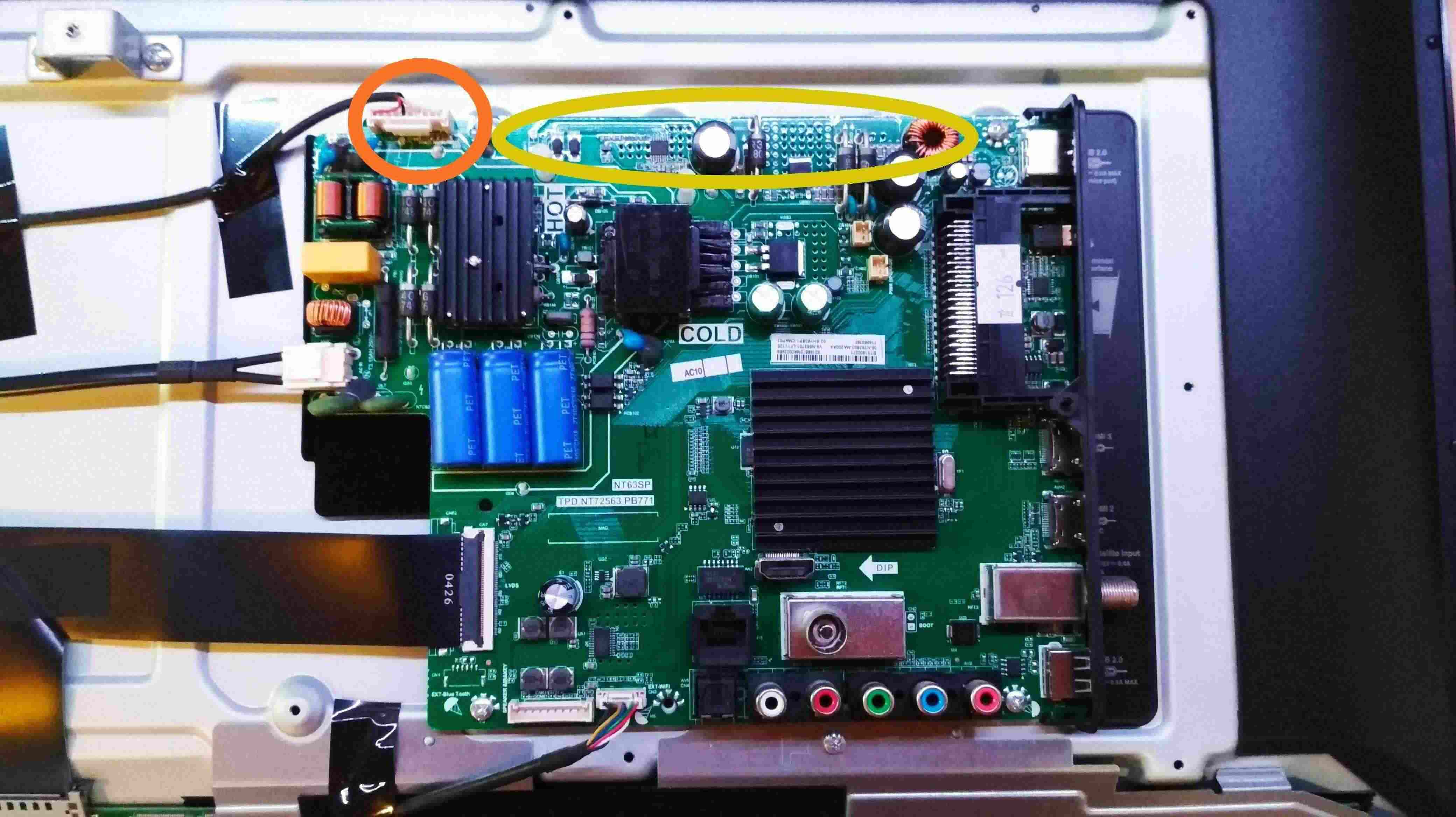 Na obrázku je foto desky. Oranžová elipsa konektor, žlutá přibližná oblast napájení led podsvícení.
