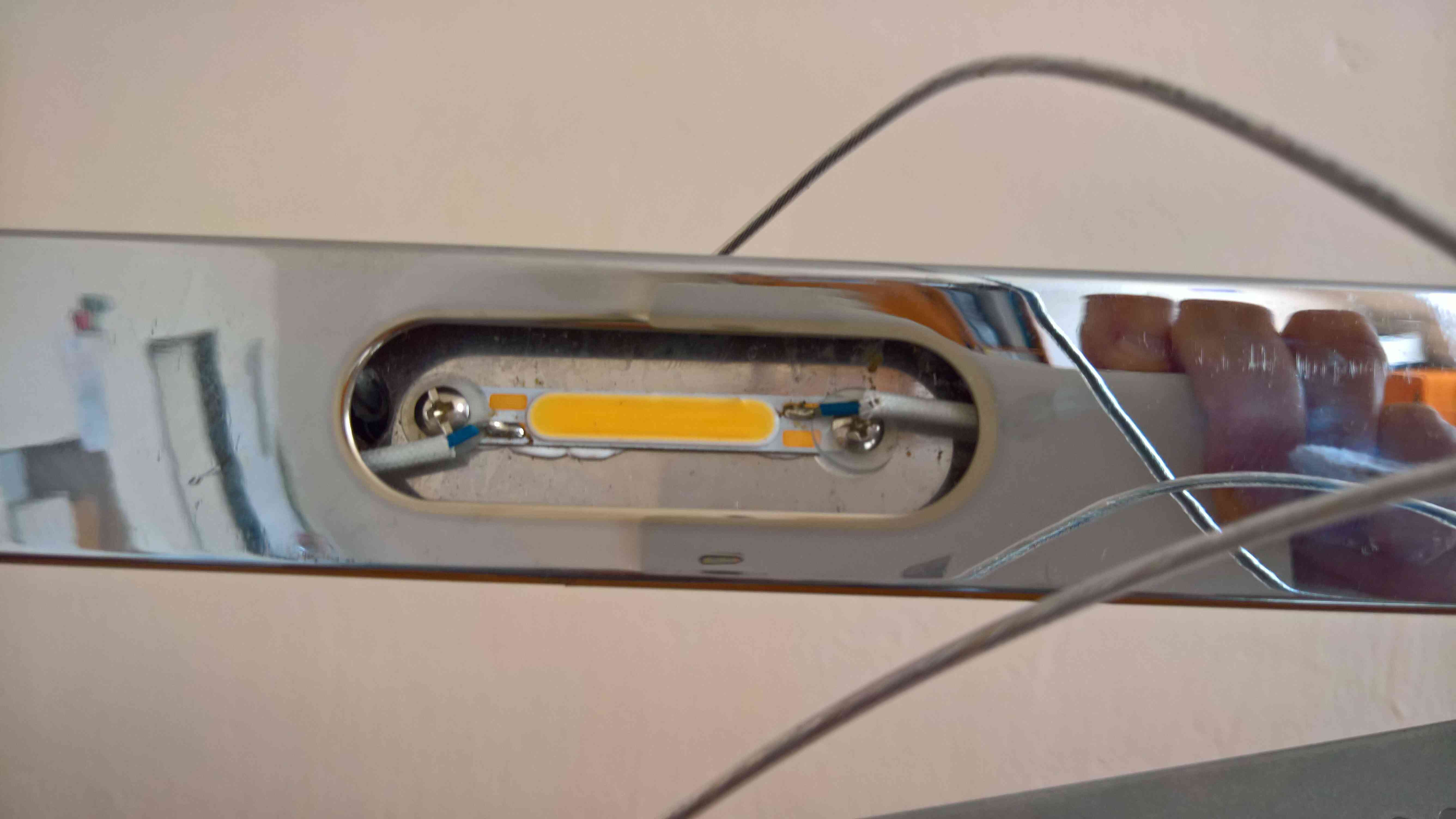 Změnu mi poslal prodejce, původně to -snad- špatně spočetli. Jsou na vyšší napětí. Tak jak byly původně (za sebou, sériově) nefungovaly. Zapojeny tedy na původní zdroj (v něm pro jistotu vyměněny elyty) serioparalelně, ve skupině 2 + 2, čili předrátována lišta. Po zapájení přilepeny teplovodivým lepidlem. Zdroj není tvrdý, nyní každá větev žere tabulkových 0,3 A a svítí. Hřejí se o něco méně, nežli původní, snad do 60°C (chvilku na nich udržím prst). Uvidíme, v provozu denně 3 - 6 hodin.