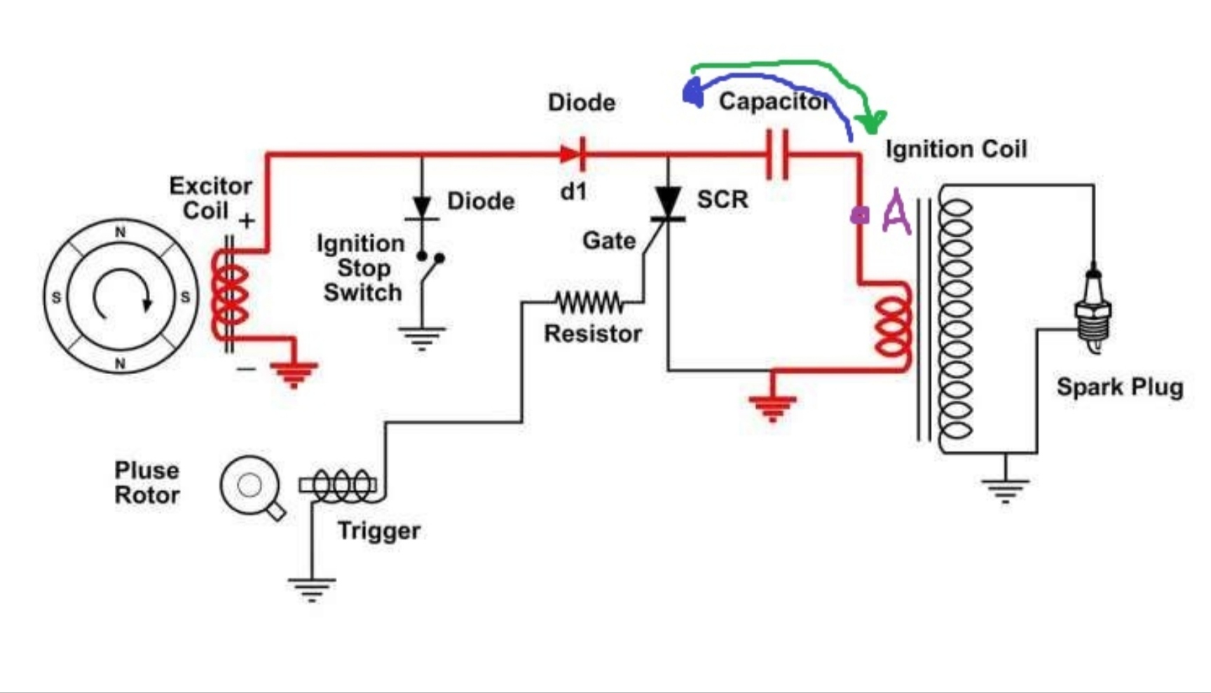 potřeboval bych poradit se zapalováním typu Capacitive Discharge Ignition, které je na jednoduchém schématu níže. Naznačil jsem tam nabíjení kondenzátoru zelenou barvou a vybíjení modrou barvou. K vybíjení kondenzátoru dochází po sepnutí tyristoru. Problém který mám je, jak přerušit zapalování, to znamená přerušit jiskru nebo jí dostatečně oslabit. Jiskra vzníká, když dochází k vybíjení kondenzátoru. Kondenzátor je impulzní, řádově jednotky uF na stovky voltů, třeba 400. Cívka má odpor řádově jednotky Ohmu. Řešení musím provádět v naznačeném bodě A. Jak toho dosáhnout?