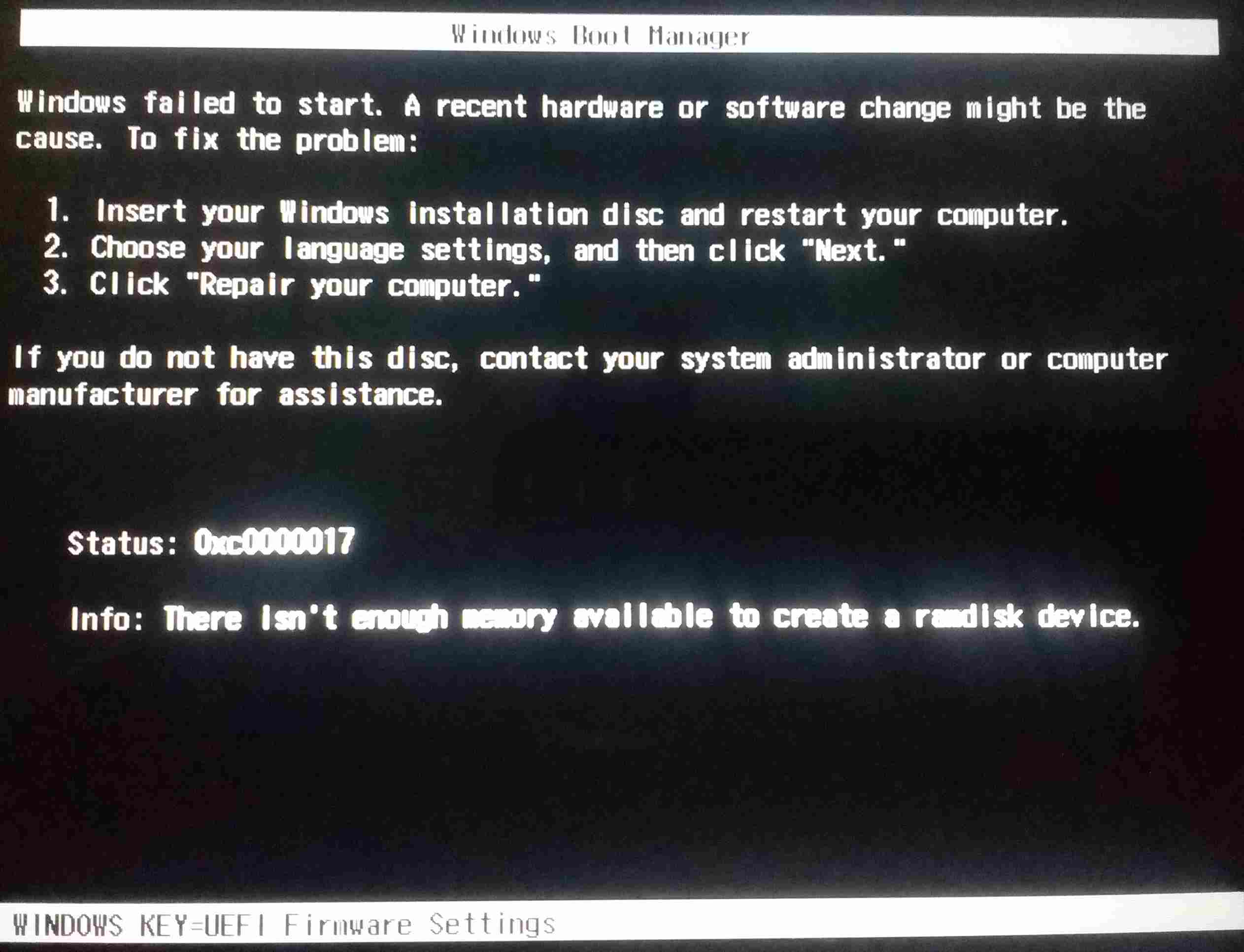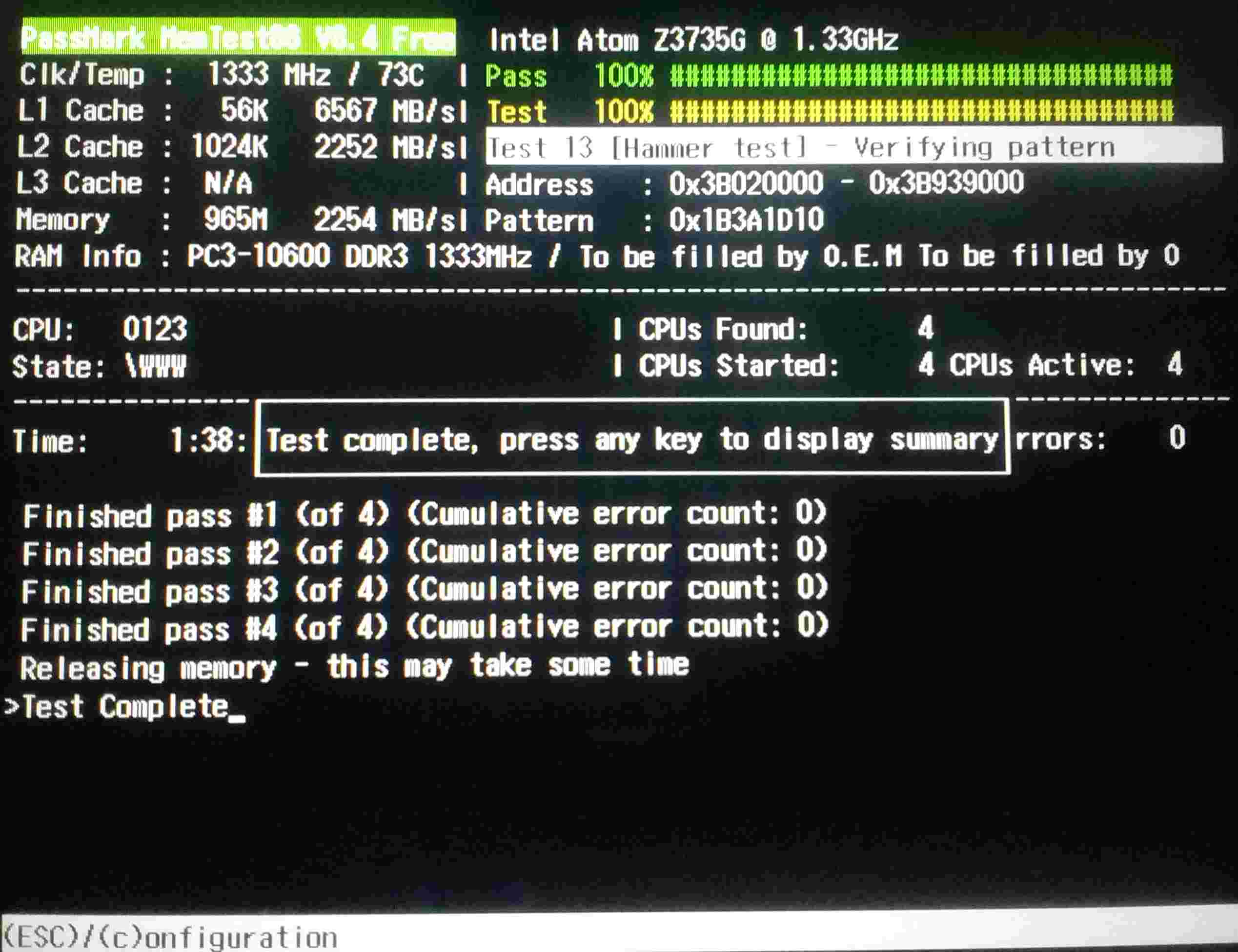 Na redukci mikroUsb jsem připojil USB rozbočovač, do něj myš, klávesnici a flešku. Rufusem jsem na ni "napálil" Win10, který jsem stáhl ze stránek MS. V boot manageru vybral flešku a skončil jsem na chybě 0xc0000017 (viz obr. 2). Abych vyzkoušel funkčnost bootování tabletu, vyzkoušel jsem taky boot memtestu z jiné flešky. Memtest nabootoval takže ok. Když už běžel nechal jsem provést test. Ram je ok (viz obr. 3).