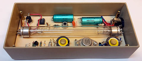 Nezabúdajte na to, že zariadenie je z roku 1993, teda už má naozaj nárok na výmenu elektrolytov. Ostatná elektronika v nej funguje bez najmenších problémov. Pri tejto príležitosti je dobré pripomenúť že napájanie beží z jednosmerných 12V/500mA nestabilizovaných. Prečo nestabilizovaných ? Nuž preto lebo inak sa nezapáli oblúk v trubici. Proste pri štarte je tam skoro 18V, po zapálení oblúku napätie krásne klesne na potrebných 12V. Takže neskúšajte to napájať 12V stabilizovaných - určite to nenabehne.