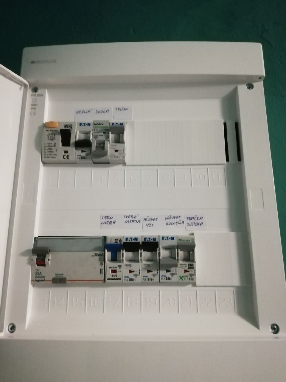 Přívod je rozdělen na dva okruhy, každý má svůj proudový chránič. Ten okruh nahoře napájí indukční varnou desku. Podle doporučení výrobce varné desky je napájení varné desky rozdělené mezi dva jističe. Napájení trouby, ledničky a zásuvek na kuchyňské lince má vlastní jistič.
