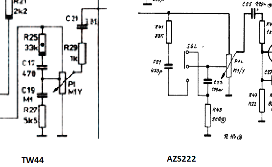 Začneme od regulátoru hlasitosti. Možná jste si při používání všimli, že je poměrně velký přeslech z neaktivních vstupů nebo při stisku tlačítka MONITOR. Dále je celkem významným problémem průběh fyziologické regulace hlasitosti, po zapnutí je zvuk celkem dunivý. Na vině je zapojení potenciometru a jeho příliš velký odpor (100k). Osobně jsem to řešil výměnou za potenciometr 25k/Y a přepočítáním součástek okolo - odpory 4x menší, kondenzátory 4x větší. Co se týká toho "dunění", napoví rozdíl odporů v basové části ve schématech AZS222 a TW44. Dále nebyl dobrý nápad, že v TESLE použili keramické kondenzátory 100n, nesedí ani kapacita, ale ani není v obou kanálech shodná. Mně se osvědčily tyto hodnoty, vycházející přepočtem z TW44: