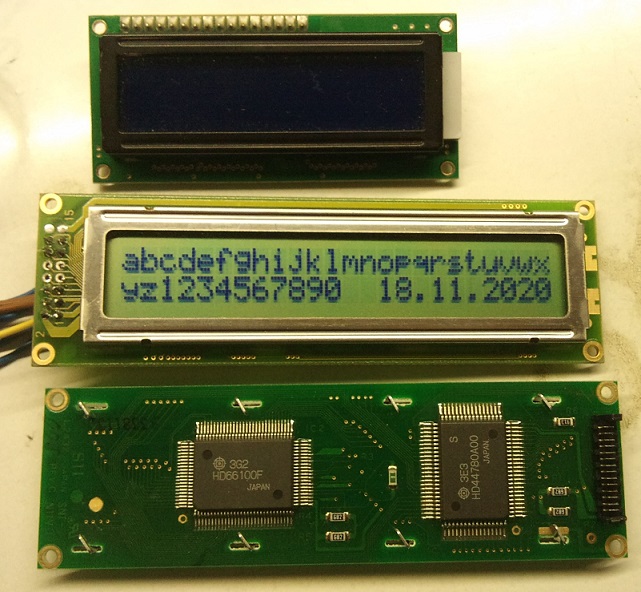Na fotce pro srovnání s běžným LCD 16x2. Displeje nejsou úplně nové, mají drobné oděrky, cena za jeden 50,-, jeden z nich má výraznější škrábanec na levé části, můžu ho darovat navíc.
