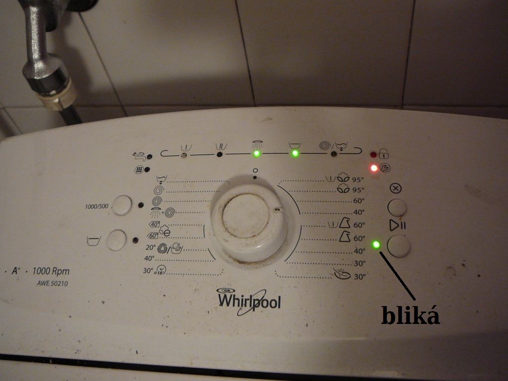 pračka wirlpool. spuštěn program, párkrát se ozve motor, potom začne napouštět, po chvíli se nic neděje a potom se rozsvítí červená kontrolka. zelená dioda pod ní začne blikat. Kde hledat chybu?