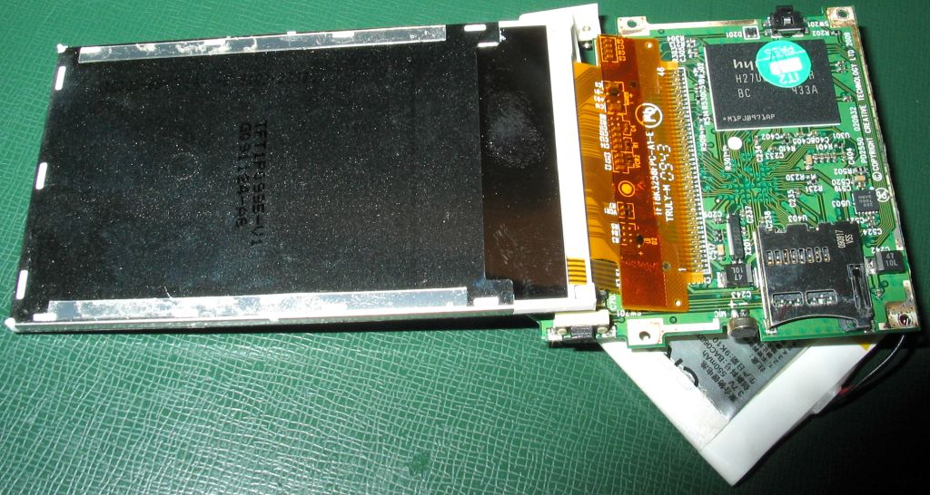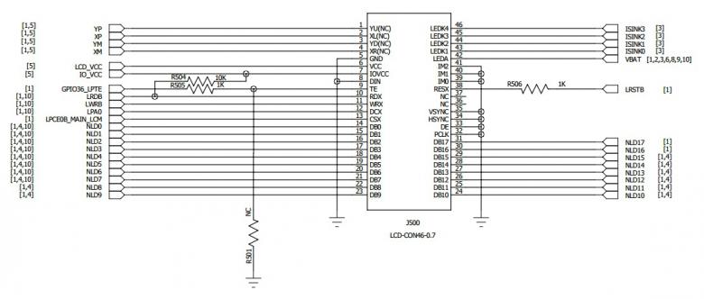 Zatial sa mi podarilo identifikovat piny 1-5 (podsvietenie), 43-46 (nezapojene), 6, 8, 9, 10, 12-15, 40, 42 (GND). Ostava 28 pinov. Tam musi byt napajanie, asi 16 datovych signalov a nejake riadiace. Na procesor sa to neda prepipat, pretoze je v BGA