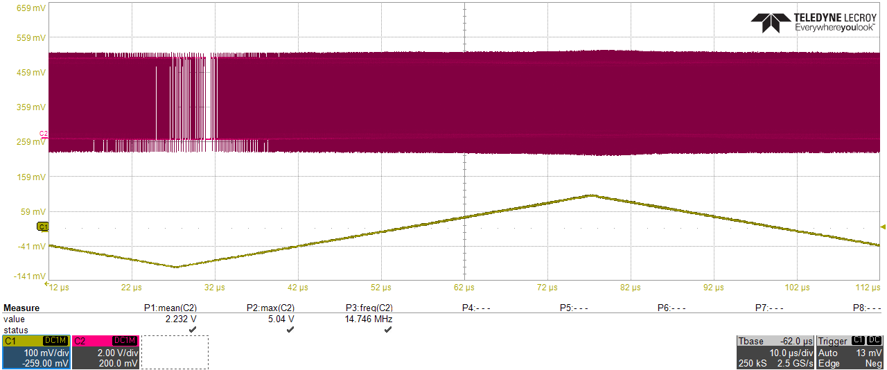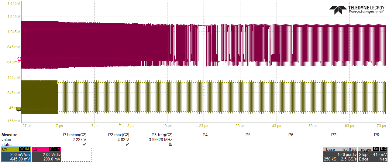 Pokud se jde se vstupním kmitočtem nahoru (žlutá křivka), výstupní kmitočet (fialová křivka) plynule stoupá dokud se ve smyčce nesrovná (po cca 40 us).