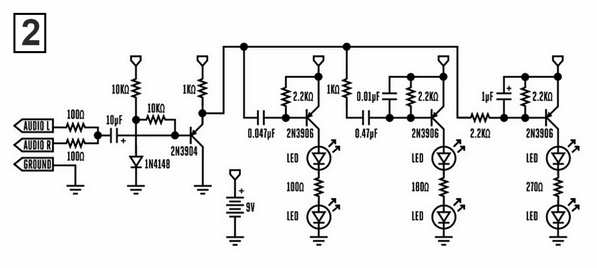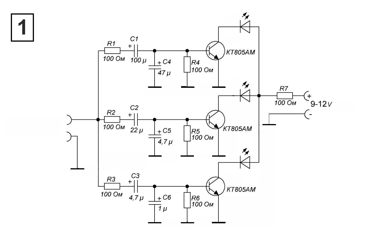Toto je jedno z nejhorších zapojení barevné hudby jaké jsem viděl. T1 bez předpětí nebude fungovat a jeho kolektor je natvrdo proti zemi zatlučen C1+C4 a C2+C5.