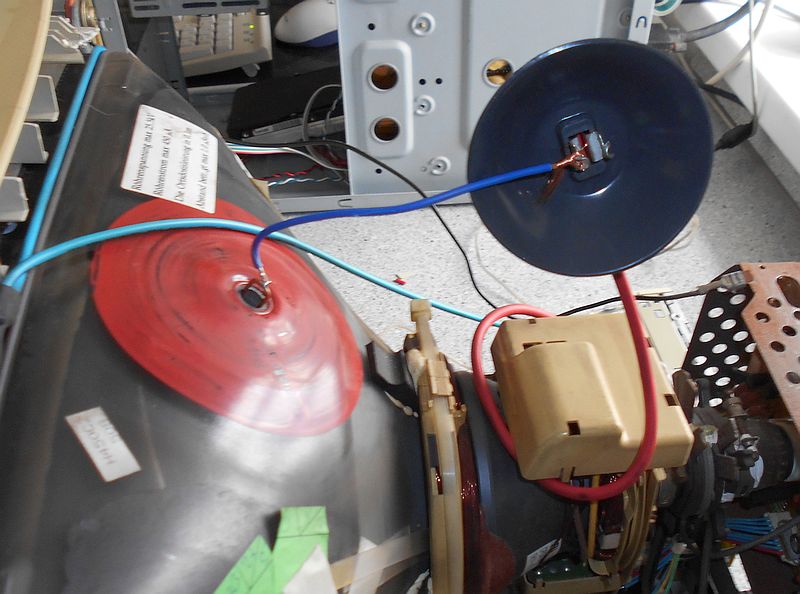 V pracovní poloze jemné sršení a ozón, po identifikaci místa sršení jsem klobouk položil "na záda" na obrazovku a propojil jeho vývod kouskem vodiče s kontaktem na baňce, aby se ničeho nedotýkal. Ihned se prošvihl plast klobouku doléhající na grafit obrazovky, viz foto.