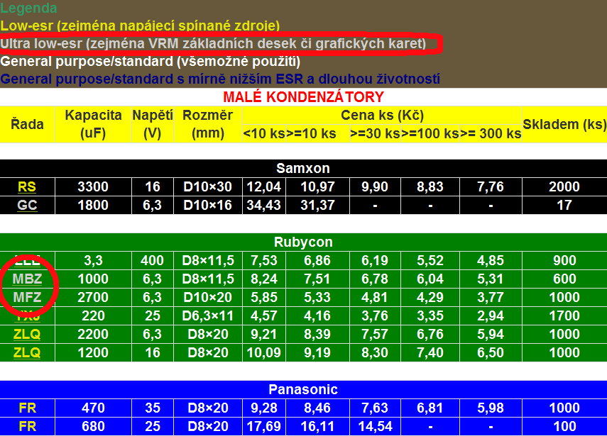 Před pár lety jsem je koupil nový a hned jsem čtyři osadil do opravovanýho zdroje Fortron Epsilon 80Plus 600. Všechny jsou to 2700 µF/6,3 V. V neděli zdroj lehl, kromě elytů to odnesl i jeden odpor a zenerka v SB zdroji. Dost jsem se divil, že jsou všechny Rubycony vyteklý, jaký ale bylo překvapení, když jsem našel vyteklý i úplně nový v zásobách. Twisted Evil Toto mi naposledy udělaly jen nějaký Jamicony a možná Hitano. U Rubyconu jsem to nečekal. Každopádně teď nevím, jestli jsou to fejky, nebo vadná série. Nebylo to kupovaný z číny. Zajímavý je, že přesně tyto se furt nabízejí, zejména na eBayi a podobných místech, přitom k MFZ nemůžu najít žádnej datasheet. Našel jsem ale dost podobný zkušenosti v různých diskuzích. Evil or Very Mad