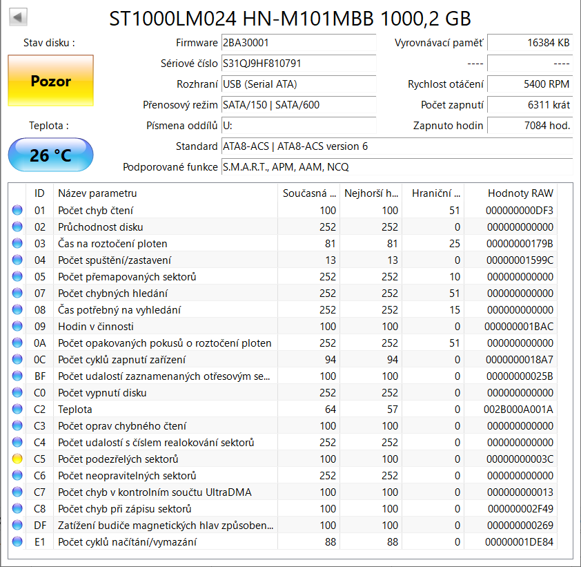 Zapsal jsem na něj samé nuly "dd if=/dev/zero of=/dev/sdb bs=1M" a výsledný SMART je nyní viz. níže. Ta předchozí C5=197 a tady je v pořádku.