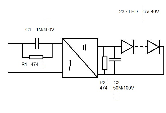 Zajímavá zkušenost – měl jsem doma dvě vadné LED úsporky tak jsem se rozhodl, že zapojím oba LED moduly s přibližně 23LEDkami do série na jeden zdroj. V úsporkách byly některé LED zčernalé, ty jsem přemostil. Zapojení je jednoduché, viz první přiložený obrázek. Chvíli se zdálo, že budu muset vrátit diplom, protože se mi nedařilo sériové zapojení LED modulů. Ze zoufalství jsem odpájel i všechny rezistory kromě R1, což samozřejmě nepomohlo, mělo to však nakonec docela zajímavý efekt. Po odhalení příčiny prvotního nezdaru jsem tedy nakonec získal LED svítidlo podle zapojení na druhém obrázku. Po zapnutí se světlo rozsvítilo a po vypnutí zůstalo trvale slabě svítit. Doma je to celkem k ničemu ale na chatě, kde není za bezměsíčné noci při zatažené obloze vidět ani ruku nataženou před obličejem, by to mohlo trochu pomoci(svítí to jenom slabě). Přívod ke světlu je dvovodičový, svícení je nejspíš způsobeno tím, že přívod funguje jako anténa na 50Hz a nakmitané napětí po usměrnění rozsvítí LEDky. V původním svítidle je kondenzátor na 100V, při přerušení kterékoli LED je napětí na kondenzátoru omezeno paralelním odporem, nejspíš to nestačí, jeden z kondenzátorů byl vystřelený. Použil jsem kondenzátor 15µF/400V.