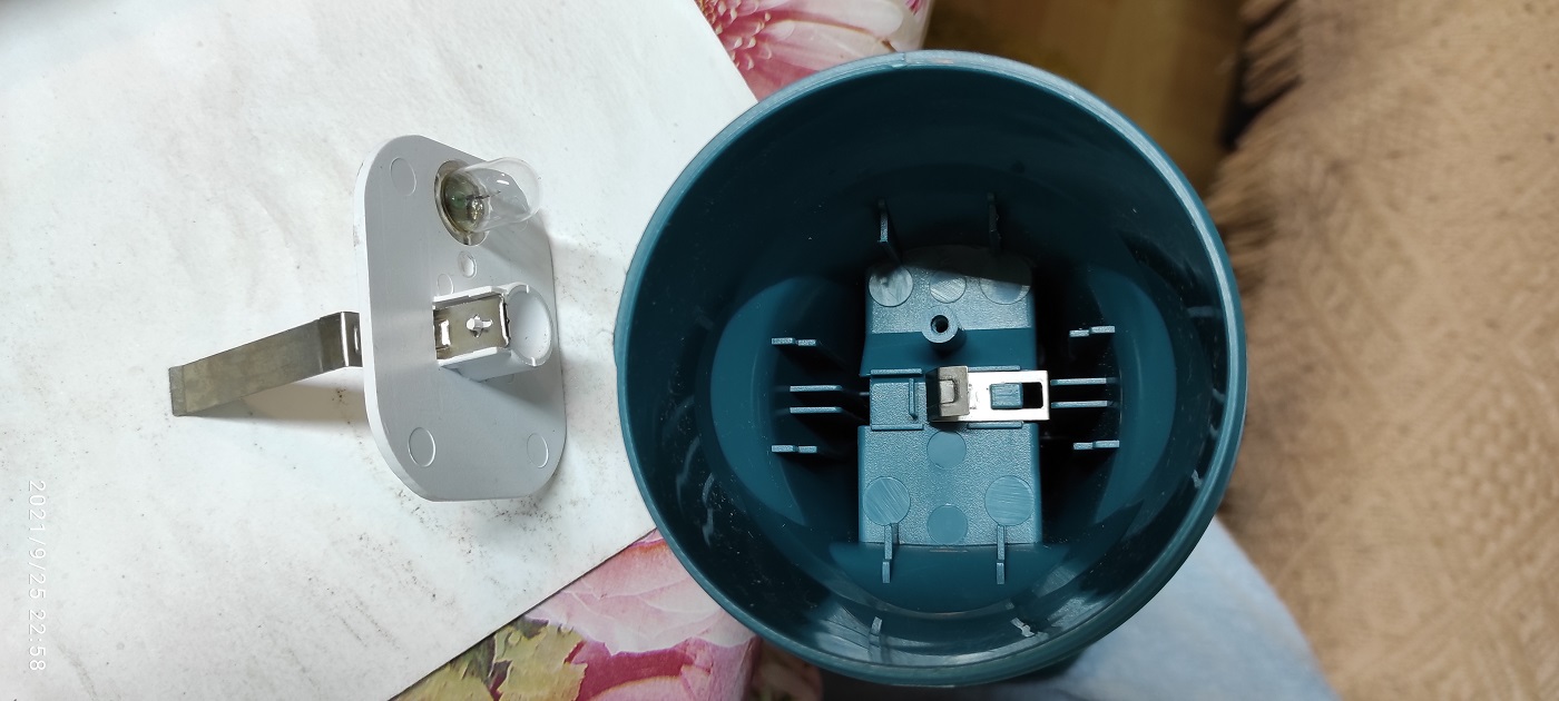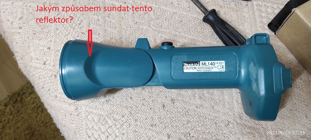 Syn mi donesl tuto svítilnu abych mu nasadil vytažený kontakt. Zkoušel jsem všemožně ten plíšek nazpět zatlačit ale nelze. Tak jsem vyšrouboval 3 šroubky jenomže ještě to drží hlavice reflektoru a tá nemá na povrchu žádné šroubky. Už se s tím hraju pár hodin ale stále mě nic nenapadá jakým způsobem to je nasazeno. Zkoušel jsem šroubováky vsunout do mezer mezi reflektorem a samotným tělesem svítilny ale hrozilo ulomení tak jsem toho raději nechal neboť to nemělo ani snahu kousek vyskočit.