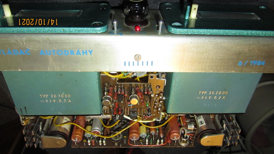 K napájení kolejí autíček používám pulzní zdroj se šířkovou modulací výstupního napětí. Zdroj jsem vyvinul asi před 50 roky jako nabíječku pro autobaterii v mém Moskviči. Akumulátoru více vyhovuje pulzní zdroj než trvalé SS napětí. Zdroj je proto doplněn kromě stabilizace nastaveného napětí také o stabilizaci výstupního proudu a vratnou elektronickou pojistku. Jen pro názornost přikládám fotky té staré nabíječky a schémata. Dnes bych asi pracně analyzoval to zapojení a funkcí jednotlivých částí obvodu. Jen si pamatuji, že jako zdroj pulzů jsem použil dvou bázovou diodu, sestavenou ale ze dvou tranzistorů T5 a T6. Dvou bázové diody tehdy nebyly k sehnání. Moduluji napětí 24 V, aby autíčka měla potřebné nízké napětí 5 až 12 V. Špičkovým napětím pulzů 24 V upravuji napájení ovládací skřínky tak, že přes diodu nabíjím kondenzátor špičkovým napětím na 24 V a obvody skřínky jsou navrženy na 24 V.